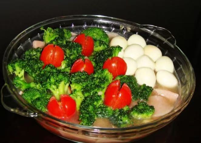 - 原料:西蘭花10克,鵪鶉蛋適量,小番茄適量,火腿50克,鹽適量。
